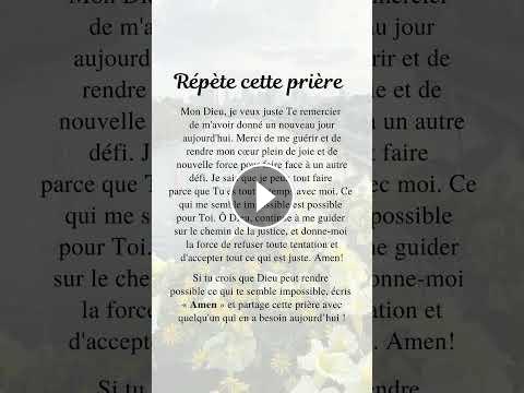 Mon Dieu, je veux juste Te remercier de m'avoir donné un nouveau jour aujourd'hui. Merci de me guérir et de rendre mon cœur plein de joie et de nouvelle force pour faire face à un autre défi. Je sais que je peux tout faire parce que Tu es tout le temps avec moi. Ce qui me semble impossible est possible pour Toi. Ô Dieu, continue à me guider sur le chemin de la justice, et donne-moi la force de refuser toute tentation et d'accepter tout ce qui est juste. Amen!
